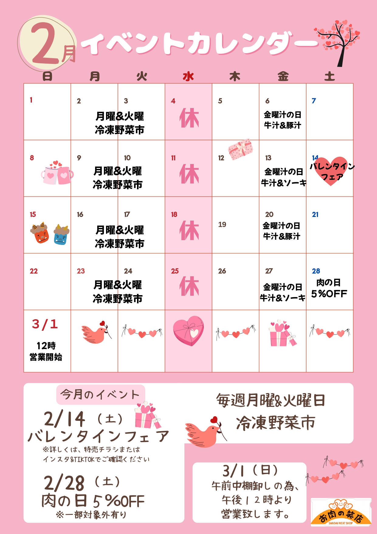 ●毎月第4土曜日はお肉の日!→店内商品5%OFF(今月は2/28)